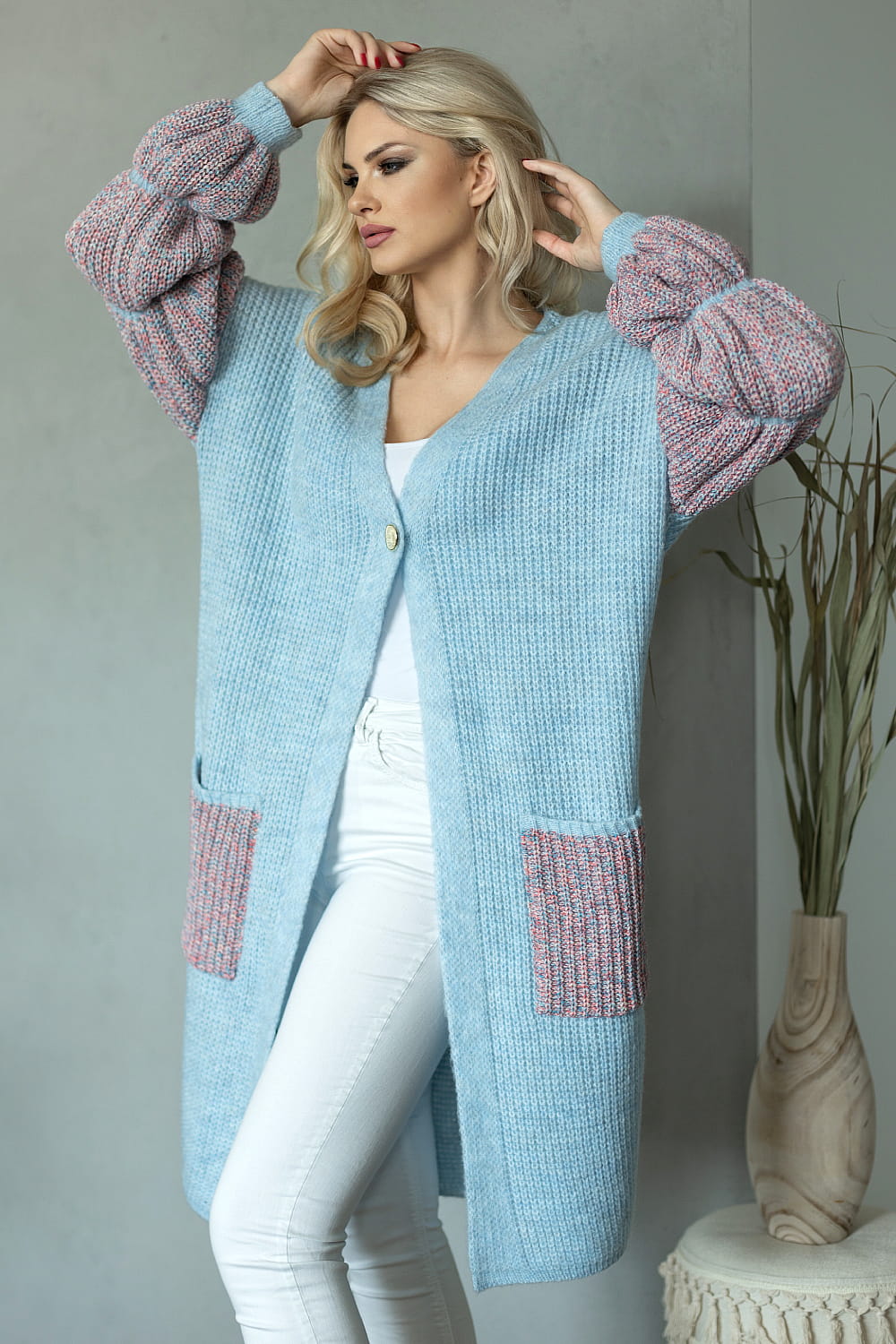 30086 DŁUGI KARDIGAN ZAPINANY NA GUZIK Z BUFIASTYMI RĘKAWAMI BŁĘKIT