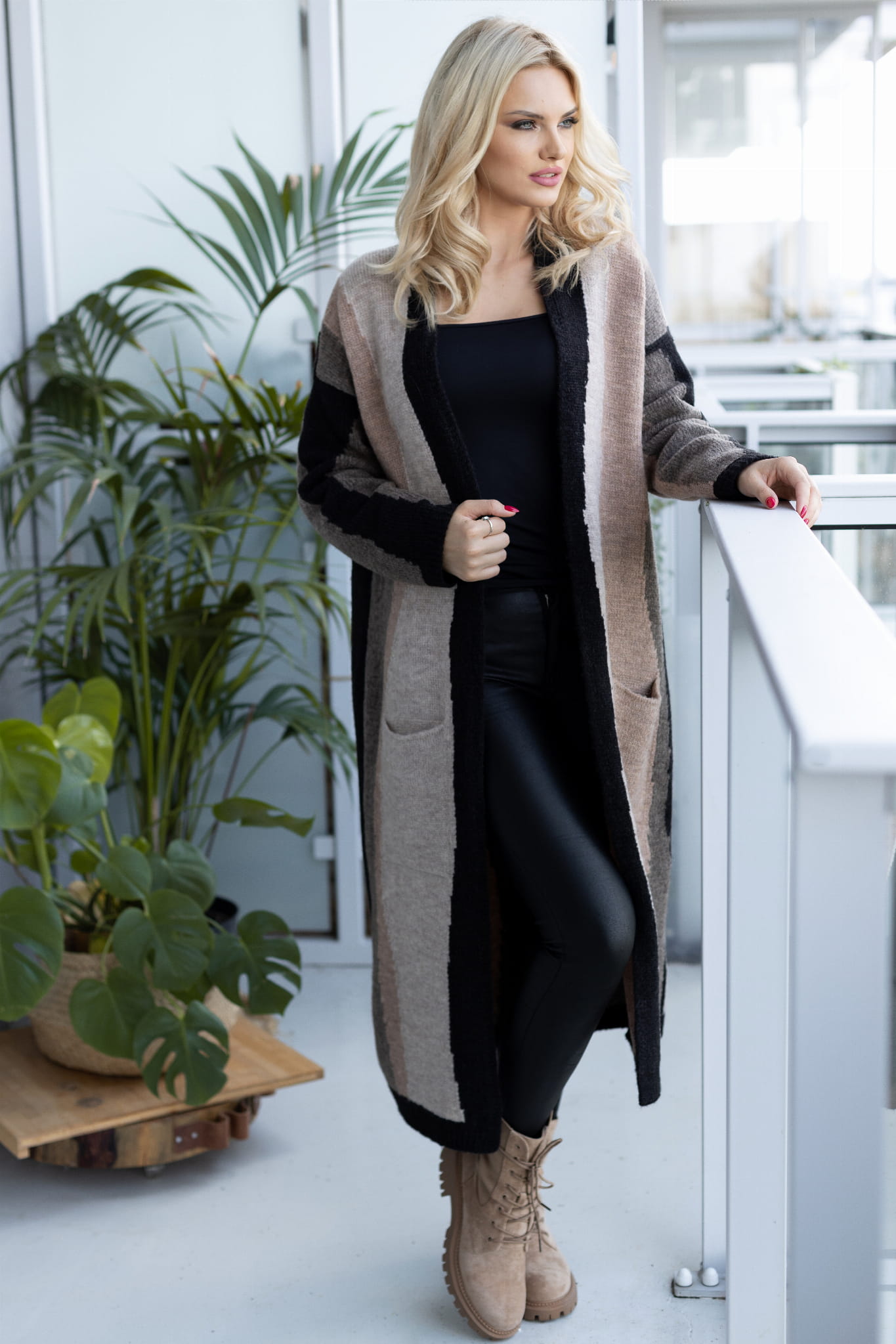 30087 KARDIGAN WIELOKOLOROWY PŁASZCZYK CZARNY/CAPPUCCINO