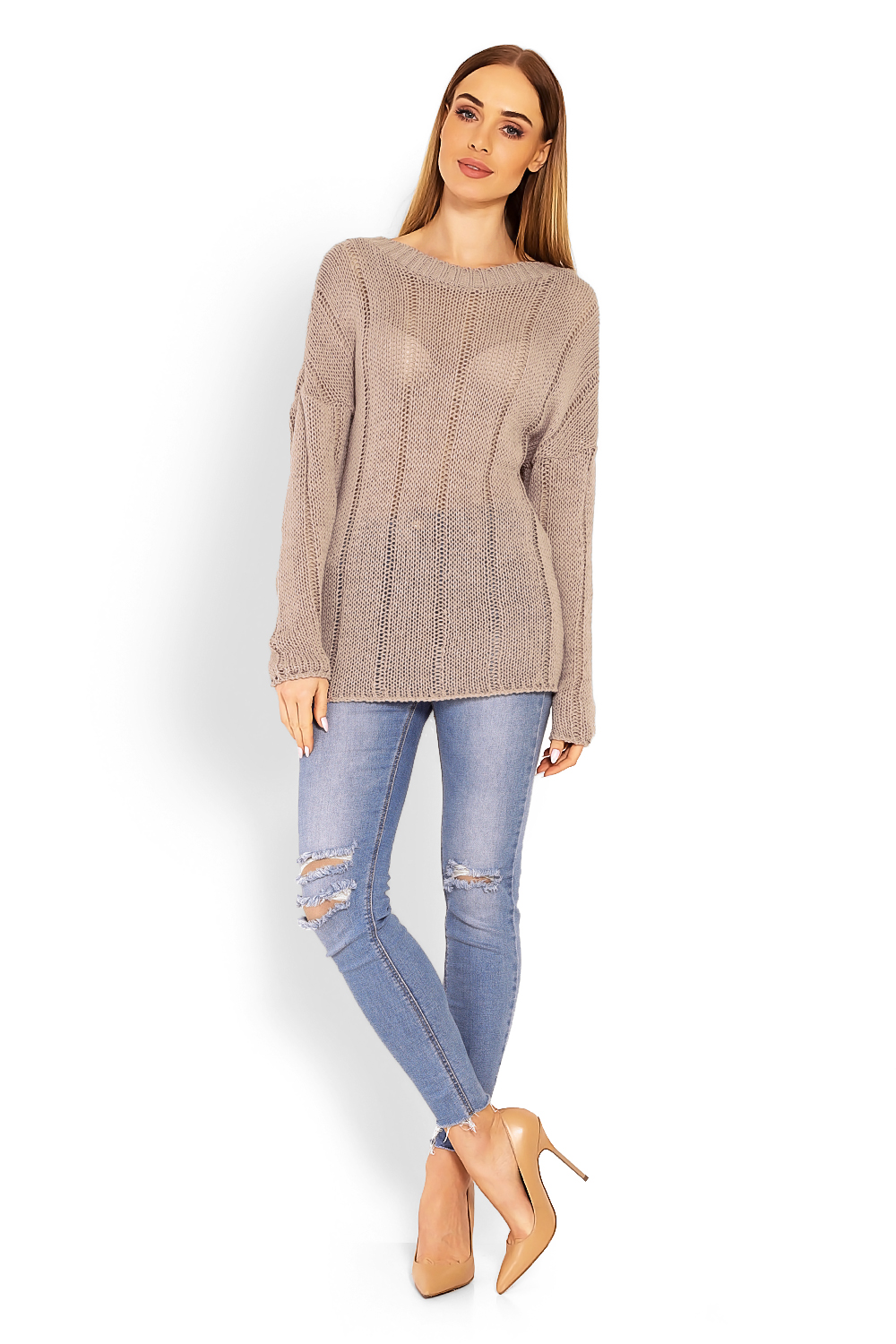 40007 LEKKI SWETEREK GOŁE PLECY DEKOLT V CAPPUCCINO