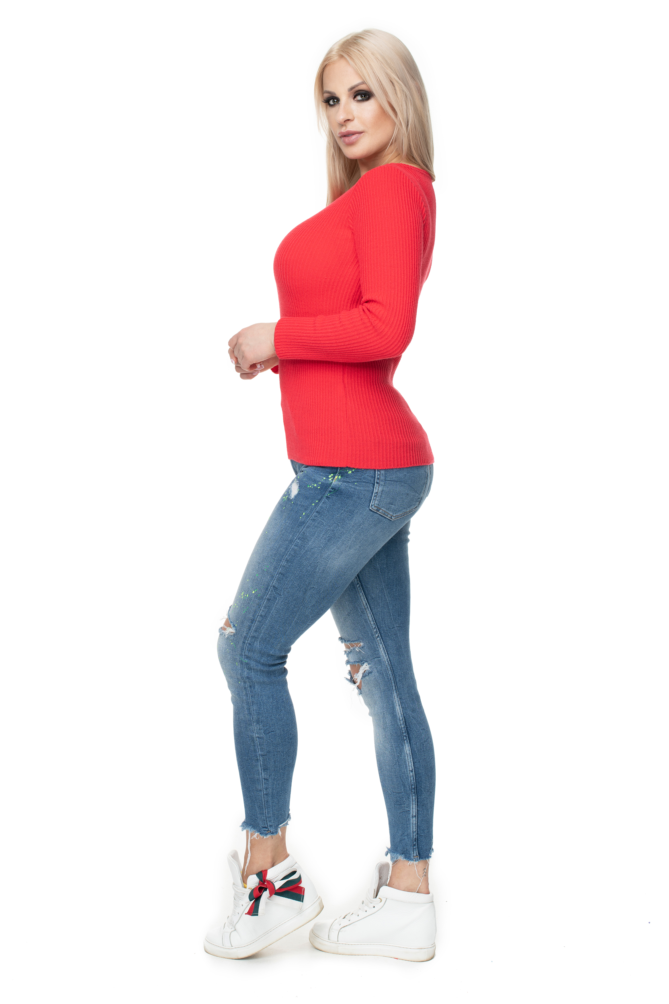 70021 KLASYCZNA BLUZKA SWETER W PRĄŻEK NEON KORAL